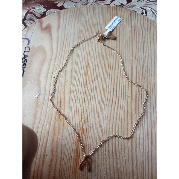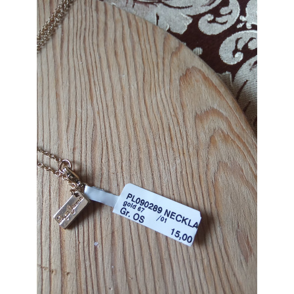 Hübsche Modeschmuck Kette . Kleiner Anhänger, Karabiner Verschluss an dem ein Label Schild von Pepe Jeans ist,