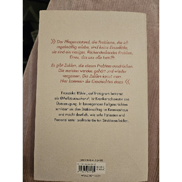 Franziska Böhler, Krankenschwester aus Überzeugung, schildert in bewegenden Fallgeschichten den Stationsalltag im Krankenhaus und macht deutlich, wie sehr Patienten und Personal unter profitorientierten Strukturen leiden.Sie hat sich für Nachtdienste und Wochenendschichten entschieden, für viel Arbeit und noch mehr Verantwortung, für einen Job, der sie fordert – ihr Herz und ihren Verstand. Nicht entschieden hat sie sich für Dienste in ständiger Unterbesetzung, für Bedingungen, die Pflege und Medizin gefährlich und unmenschlich machen. Und doch finden sich Pflegekräfte immer öfter in dieser Situation: Sie arbeiten in einem Gesundheitssystem, das längst selbst dringend Hilfe braucht.In ergreifenden Fallgeschichten aus ihrem Arbeitsalltag, aber auch von Patienten, Hebammen, Auszubildenden und Ärzten macht Franziska Böhler deutlich, wieviel Leid der Kostendruck und der Personalmangel in Krankenhäusern und Altenheimen verursachen...