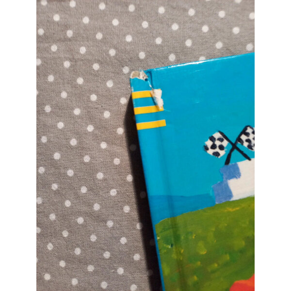 Eine Kante am Buch oben mit kleinem Riss, eine Klappe mit Riss, ansonsten sehr guter, bespielter Zustand