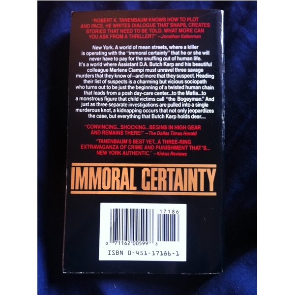 This cynical, fast-moving novel, the third in the Butch Karp series, concerns the workings of the judicial system in the Big City. The neat plot combines Satanism, pedophilia, Mafiosi, good-looking cops, corrupt judges, sociopaths, a pregnant one-eyed assistant district attorney who roller skates, and a love story, into something special. Tanenbaum, coauthor of two nonfiction crime books as well as De praved Indifference ( LJ 7/89) and No Lesser Plea (Watts, 1987), is also a former assistant district attorney and chief of homicide. As timely as tomorrow's nightly news, but not for the squeamish.