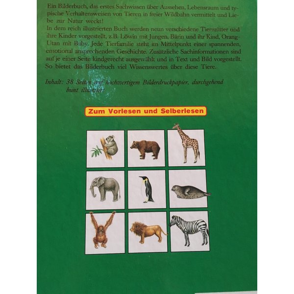Ein Bilderbuch, das erstens Sachwissen über Aussehen, Lebensraum und typische Verhaltensweisen von Tieren in freier Wildbahn vermittelt und Liebe zur Natur weckt! In dem reich Illustrierten Buch werden neun verschiedene Tiermütter und ihre Kinder vorgestellt, zum Beispiel Löwen mit jungen, Bärin und ihr Kind, Orang-Utans mit Baby. Jede Tier Familie steht im Mittelpunkt einer spannenden emotional ansprechenden Geschichte. Zusätzliche Sachinformationen sind auf je einer Seite kindgerecht ausgewählt und in Text und Bild vorgestellt. So bietet dieses Buch viel Wissenswertes über diese Tiere. 38 Seiten aus hochwertigem Bild Druck Papier, durchgehen und illustriert