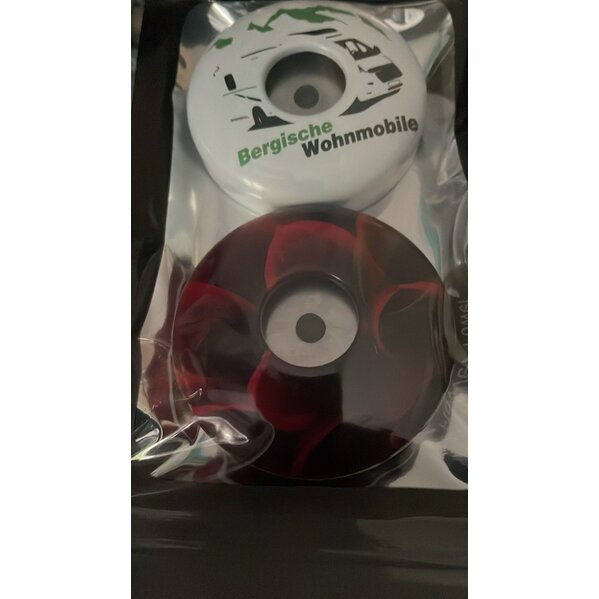2 Deckel für offene Dosen Getränkedosen. Auf einem Deckel Aufschrift Bergische Wohnmobile.