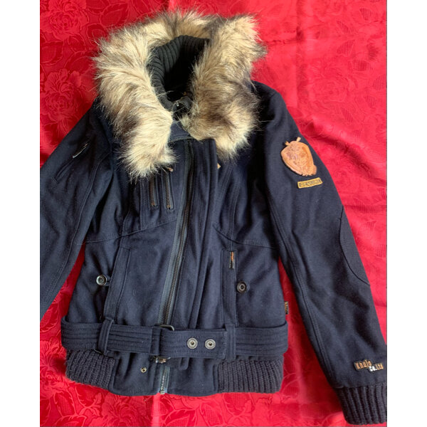 Khujo Jacke Größe M ausgezeichnet, fällt aber wie so oft bei Khujo etwas klein aus. Deshalb biete ich sie in Größe S an. Hab leider vergessen sie zurück zu senden. Sie hat etwa 200 Euro gekostet. Mit vielen Details, Fell kann abgenommen werden, auch der Strickeinsatz. Dunkles Blau,