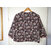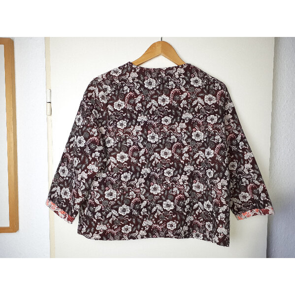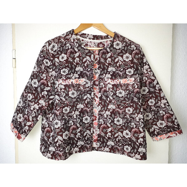 Geblümte Blazerjacke, kastig geschnitten mit zwei aufgesetzten Brusttaschen und Dreiviertelärmeln. Offen zu tragen oder mit zwei Häkchen zu schließen. Brustweite 50cm, Länge 56cm.