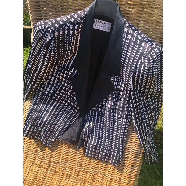 Tolles Jäckchen in schwarz weiß. Passend zur schwarzen Hose ein Hosenanzug für den perfekten Auftritt im Büro oder eleganten Anlass. Retro Stil der 80 ger Jahre. Schulterpolster, Schösschenform. Ungefüttert.