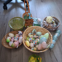 4 Osterdeko zum hängen aus leichtem Holz mit Perlen u. Bändern,beidseitig sichtbar,Gebrauchsspuren vorhanden ... mehr