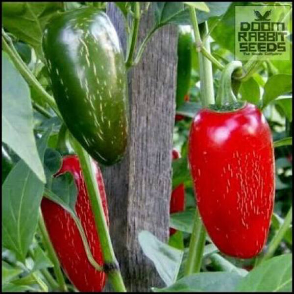 Die Sorte 'Jalapeño Ruben ist ein sehr ertragreicher, dickfleischiger Chili, der Früchte von etwa 7 cm Länge mit abgerundeter Spitze hervorbringt