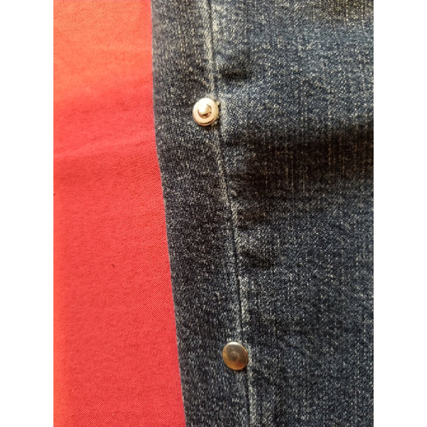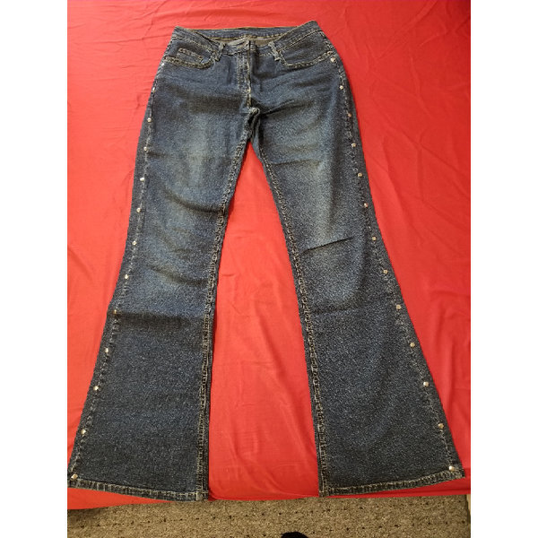 Jeans mit unten ausgestellten Beinen (Bootcut), von mir selber mit Nieten verziert (siehe Foto, zwei verschiedene Arten von Nieten), Innenbeinlänge ca. 83 cm.