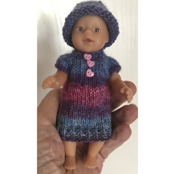 Handgestrickte Kleidung für Puppe 12 cm, bestehend aus Kleid in blau, lila und pink, mit Druckknopfverschluss hinten und kleinen pinken Herzknöpfchen vorn. Dazu noch einen Hut in den gleichen Farben