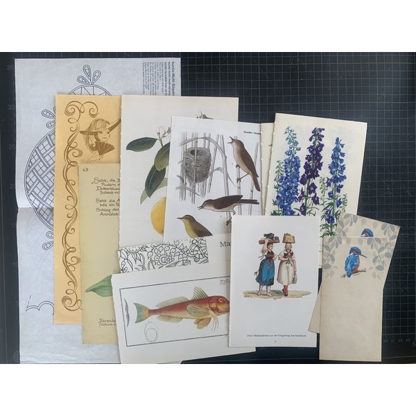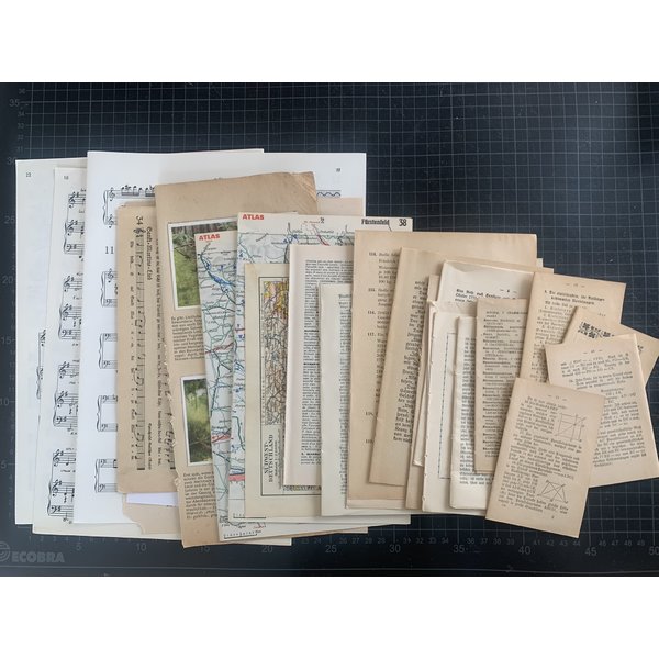 Eine reiche Auswahl mit Papier aus alten Büchern wie Atlanten, Wörterbüchern, Romanen, Dramen, Lehrbüchern etc.