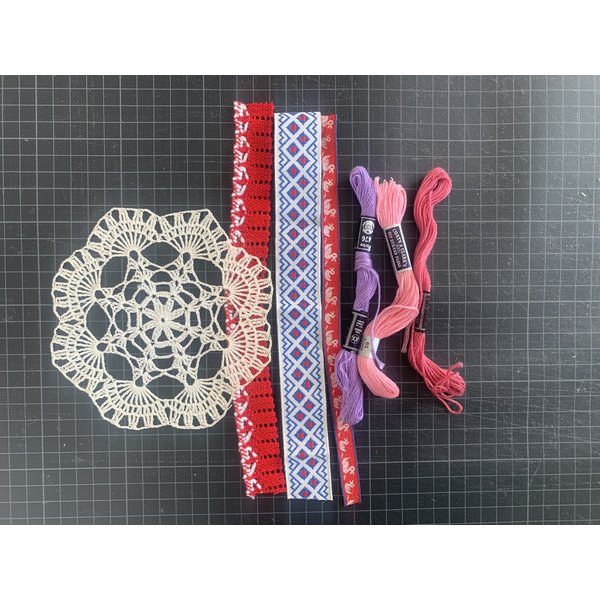 Dazu noch ein Häkeldeckchen, Borten und Stickgarn.