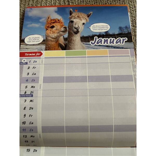 Familienplaner 2026, Kalender Tiere, viele Eintragemöglichkeiten, unaufgeklappt kleiner A4