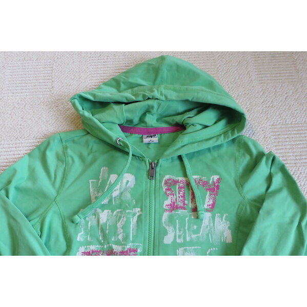 Dünne Sweatshirtjacke in einem knalligen Grün, hat meiner Tochter mit Gr. 158 gepasst. 70 % BW 25 % Polyester, 5 % Elasthan. Versand als BÜWA, bitte keine Packstation, NRH.