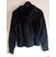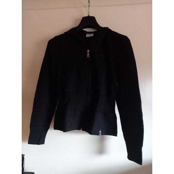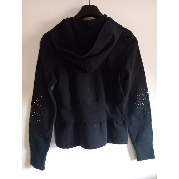 schwarzes Kapuzenoberteil mit Reißverschluss vorn, eng geschnitten, mit Raffung gerippt im Taillenbereich, Glitzersteinchen an den Ellenbogen