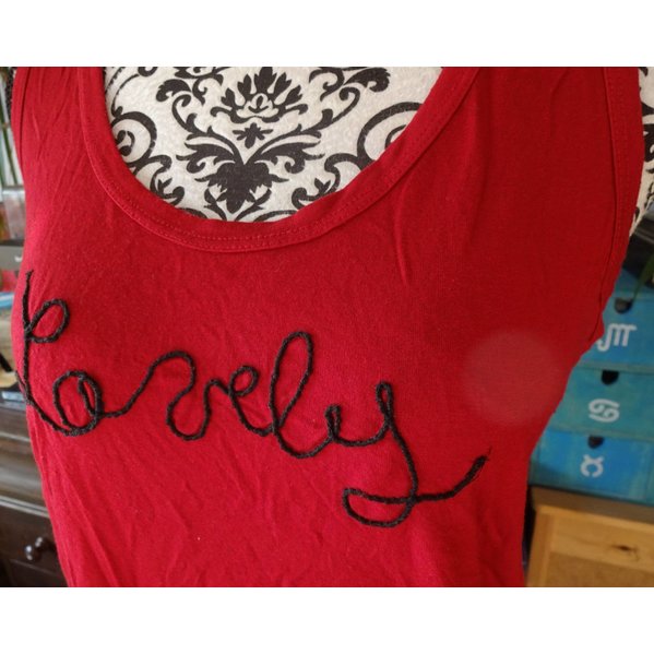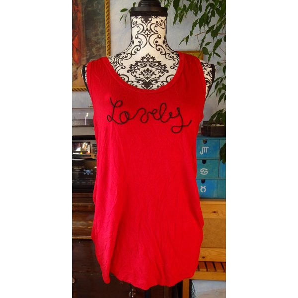 Weich fließendes Top in kräftigem Karmesin-Rot, blaustichig-dunkler als auf den Fotos, am ehesten noch wie auf Foto 2. Vorne aufgenähter Schriftzug "Lovely". Sehr dehnbar.