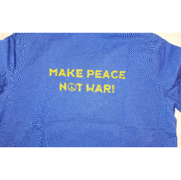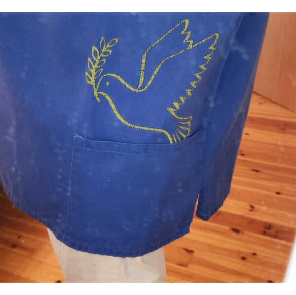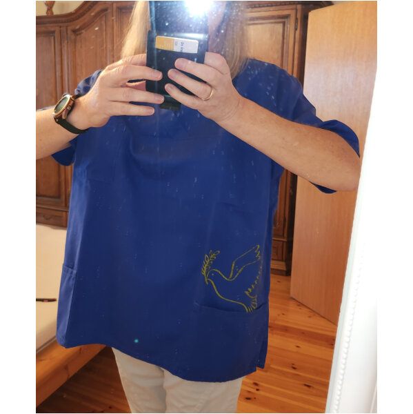 Schlupfkasack in xl abzugeben. Brustweite 63 cm ,Gesamtlänge 70 cm. Friedenstaube auf einer Tasche. Der Kasack fällt großzügig aus.