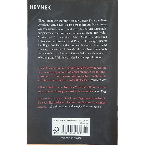 Glaubt man der Werbung, ist für unsere Tiere das Beste gerade gut genug. Doch die Realität sieht anders aus: Mit Aromen, Geschmacksverstärkern, Farbstoffen und dem ganzen Arsenal der Kunstnahrungshexenküche wird ein „leckeres“ Menü für Waldi, Minka und Co. zubereitet. Neben Abfällen, Krallen und Klauen landen auch Klärschlamm, Bakterien und Pilze im Fressnapf unserer Lieblinge. Die Tiere leiden und werden krank. Und nicht nur sie, sondern durch den Verzehr von Nutztieren auch der Mensch. Schockierende Fakten, brillant recherchiert – Werbung und Wahrheit bei der Tierfutterproduktion.