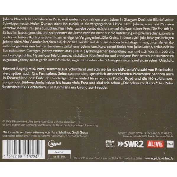 Edward Boyd (1916-1989) stammte aus Schottland und schrieb für die BBC eine Vielzahl von Kriminalserien, später auch fürs Fernsehen. Seine spannenden, sprachlich ansprechenden Mehrteiler bannten auch in Deutschland seit Ende der Sechziger Jahre viele Hörer vor das Radio. Boyd und die Hörspielumsetzungen des Südwestfunks haben bis heute viele Fans und sind wie schon Die schwarze Kerze bei Pidax erstmals auf CD erhältlich. Für Krimifans ein Grund zur Freude.