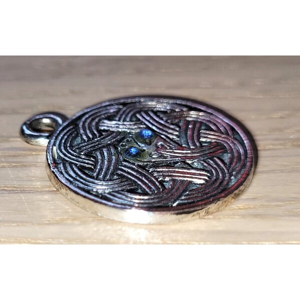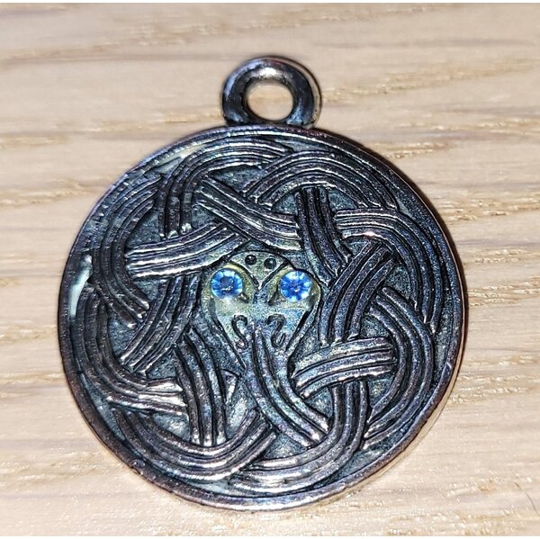Ein Anhänger in runder Form, 2,5 cm Ø, mit dem keltischen Knoten. In der Mitte des Anhängers zeigt es sich, dass es sich um eine Schlange handelt. Zwei blaue Glasaugen leuchten im Licht.