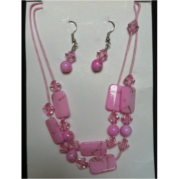Kette besteht aus kleinen Teilchen in rosa mit goldenen Verzierungen, die auf einem Band draufgefädelt sind. Sie liegt eng am Hals, keine lange Kette. Dazu passende kleine Ohrhänger.