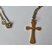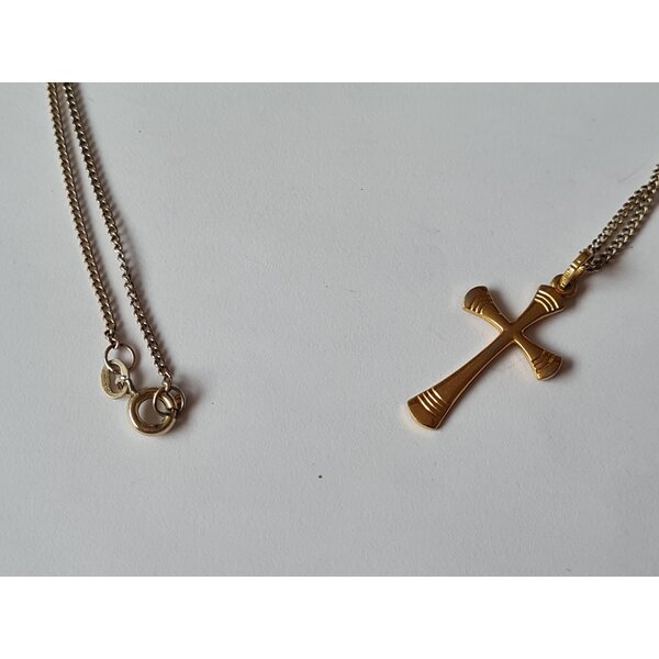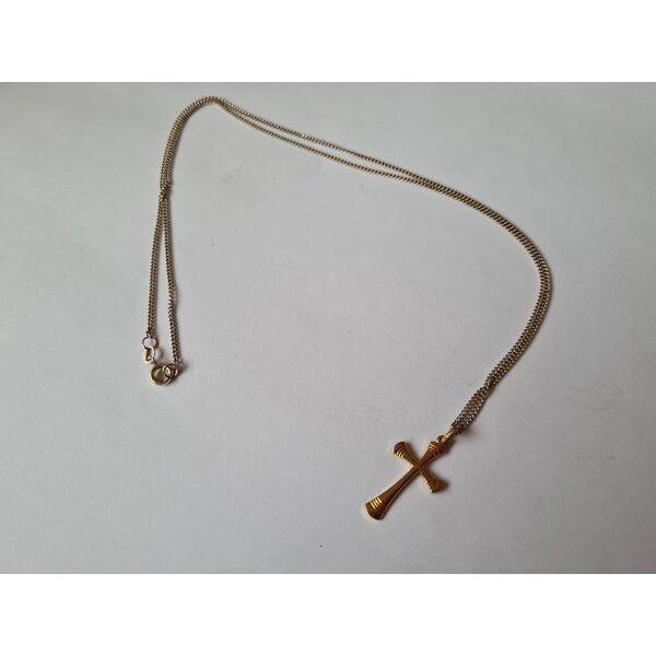 Kette ist 56 cm lang und mit double gestempelt. Kreuz 3 cm lang. Die Öse ist mit golddouble gestempelt. Das Kreuz mit einem nicht erkennbaren Stempel.