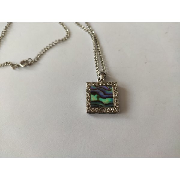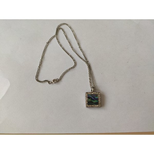 Kette mit schillerndem Anhänger Muschel und Steinchen.