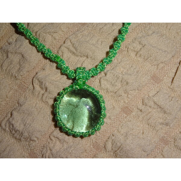 Von mir handgefertigte Kette mit einem klaren Glasstein von hellgrüner Farbe. Die Kette ist längenverstellbar. Da keine Metallteile verarbeitet wurden, ist sie auch für Allergiker/innen geeignet.