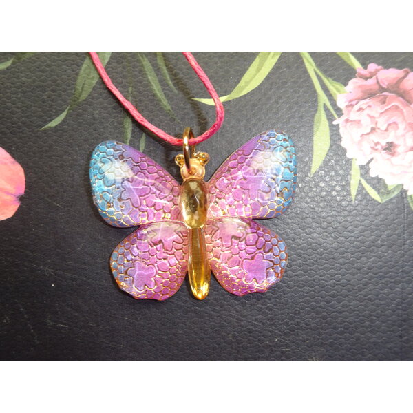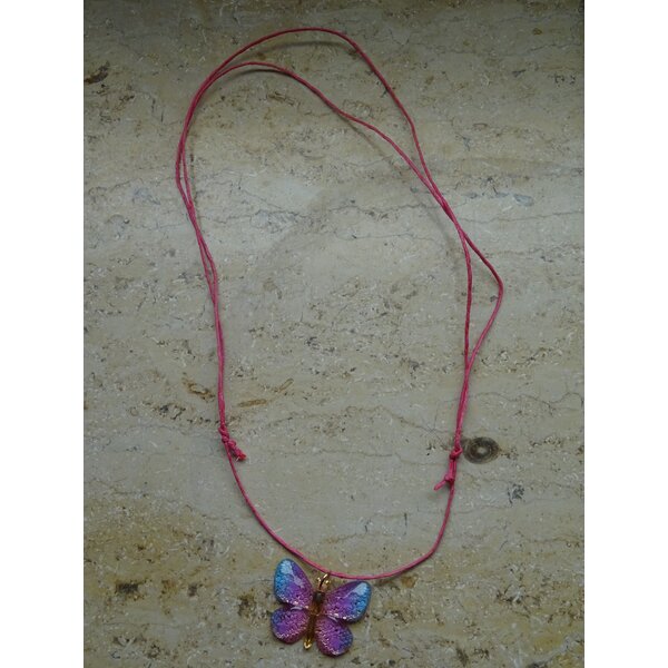 Farbenfroher Schmetterlingsanhänger an einem längenverstellbaren Bändchen, hab ich jetzt mal für Mädchen eingestellt, kann aber auch von Damen getragen werden, passt locker über einen erwachsenen Kopf. :o)