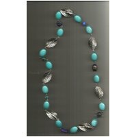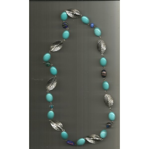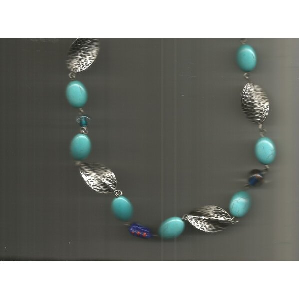 Kette mit gebogenen stilisierten Blättern, wahrscheinlich aus Tibetsilber, abgeflachten olivenförmigen türkisfarbenen Perlen + verschiedene teils handgefertigte farbige Glasperlen
