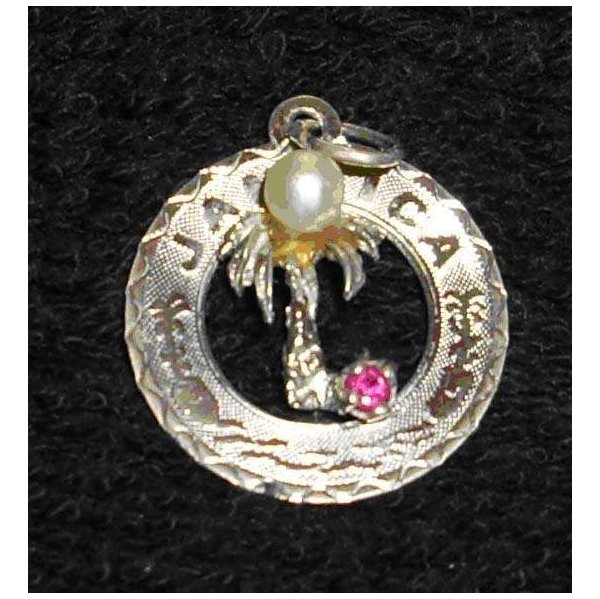 Es handelt sich dabei um einen Kettenanhänger, rund, mit dem Schriftzug "Jamaica", silberfarben, Palme mit Perle und rotem Steinchen verziert