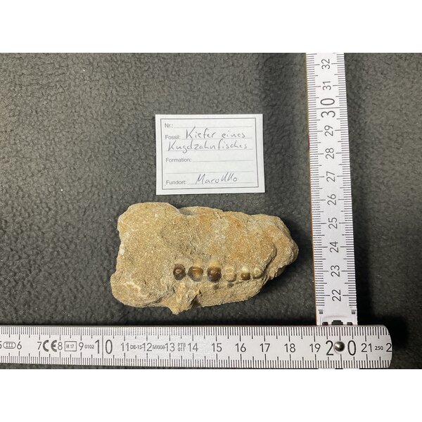 Zum Tausch kommt hier: der Kiefer eines Kugelzahnfisches mit diversen gut erhaltenen Zähnen. Das Fossil stammt aus Marokko.
