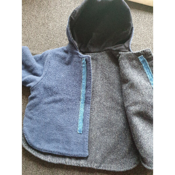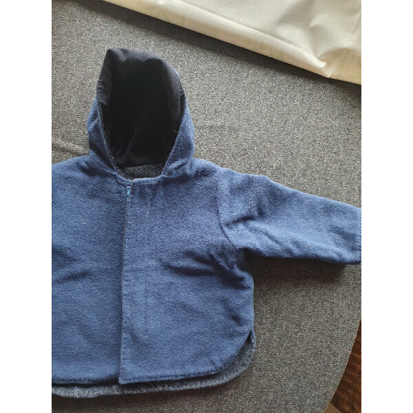 Warme Kinderjacke aus Wolle, teilweise mit 20% Poly- Anteil, sichtbare Nähte handgenäht, auch der Reißverschluß ist per Hand eingenäht. Der Stoff ist außen eher königsblau, also etwas dunkler. Die Jacke fällt etwas breiter aus, von Achsel zu Achsel sind es 41 cm, Ärmellänge und Gesamtlänge( wird schnellstmöglich ergänzt)