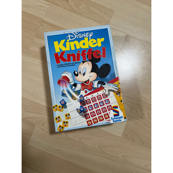 Disney Kinder Kniffel - Lustiges Würfeln mit Micky und seinen Freunden. 2-5 Spieler ab 4 Jahren. Gewinner ist, wer als erster seine Ablegetafel mit Micky-Maus-Plättchen vollständig bekniffeln konnte, indem er wärend des Spiels möglichst viele Würfel mit demselben Motiv kniffelt.