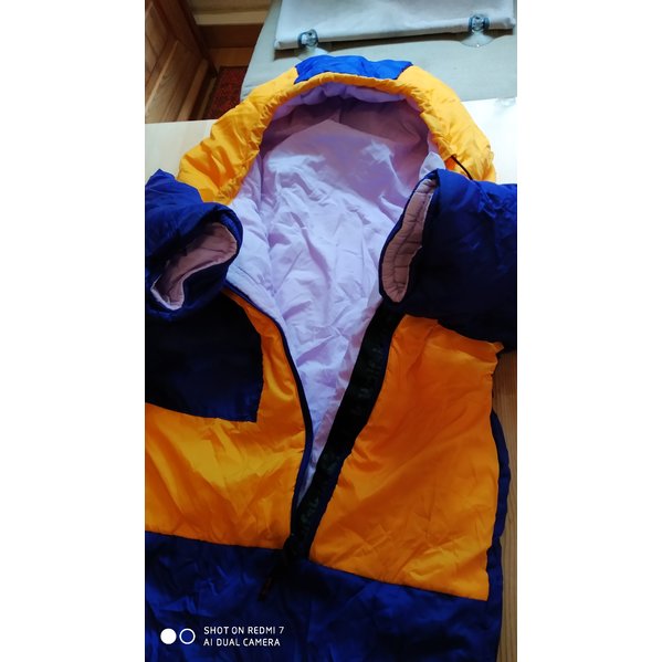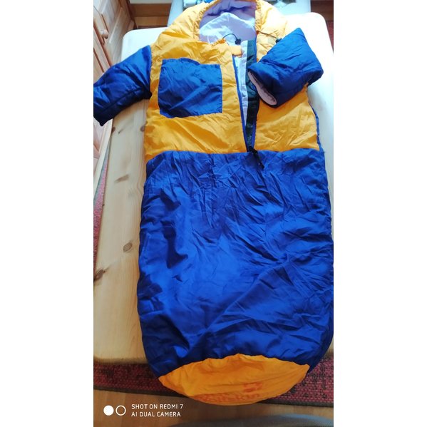 wenig benutzt, lag aber 25 Jahre im Schrank, Aufdrucke leicht verblasst, die Innengummierung des Packsacks hat sich gelöst und bröselt