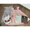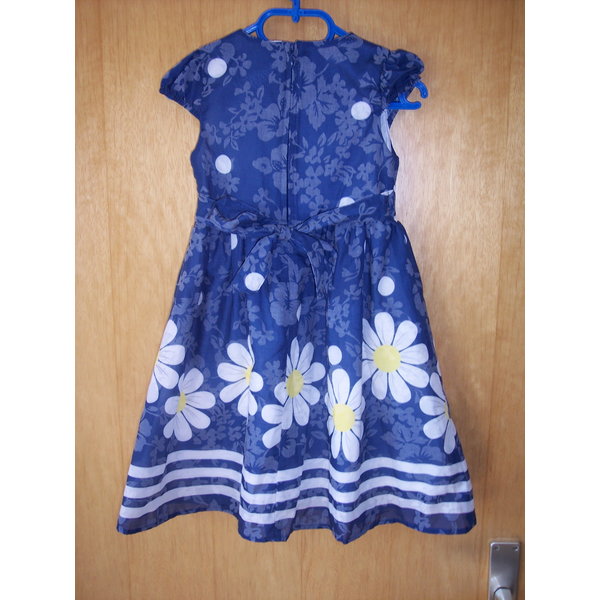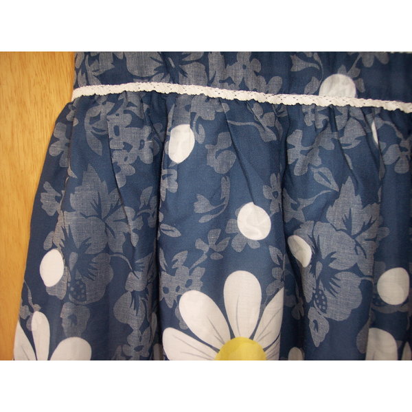 Kleid mit Blumenmuster und Spitzenbordüre, gefüttert. Wird hinten mit Reißverschluß geschlossen und hat zusätzlich ein Bindeband.