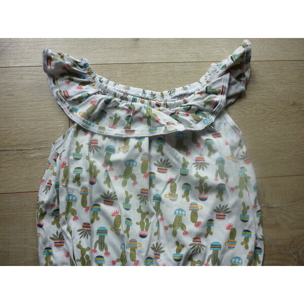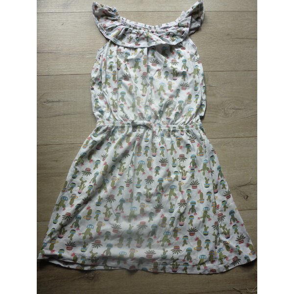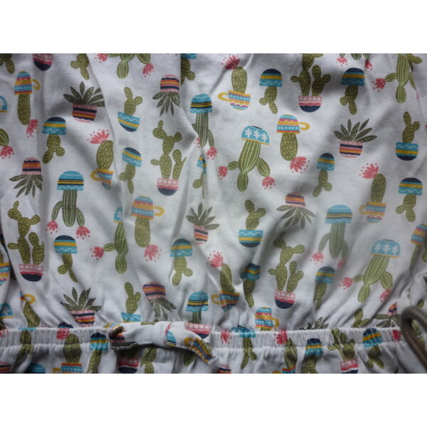 Biete hier ein Sommerkleid mit Rüsche oben, Gummizug und Zierschleife in der Taille, Kakteenmuster, Größe 122/128, Baumwolle mit Elasthan, gut erhalten, etwas Waschpilling
