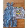 Kleiderpaket mit 3x lange Hose (Liegelind, Feetje, Reserved) in Blau, Türkis. 1x kurze Hose (Topomini) in blau. 2x Langarm-Shirt (Topomini, Manguun) in grau/weiß gestreift und weiß mit blauen Flugzeugen. 1x Kapuzenjacke (impidimpi) in Blau und 1x Strickjacke (H&M) in grau.