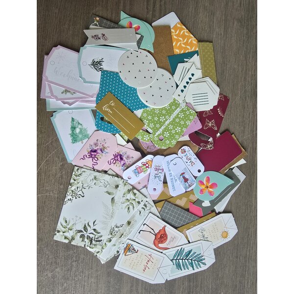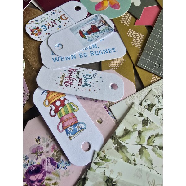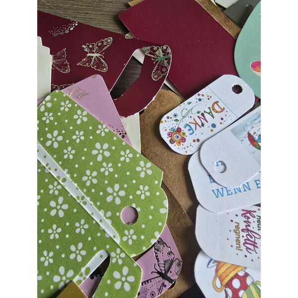 Ich nutze gerne Tags wenn ich etwas verkaufe, aber diese sind für meine Zwecke ein wenig zu klein. Sie haben sich mit der Zeit angesammelt und dürfen komplett weiter ziehen. Alles sind mit Muster oder Schriftzügen und sie sind alle unbenutzt