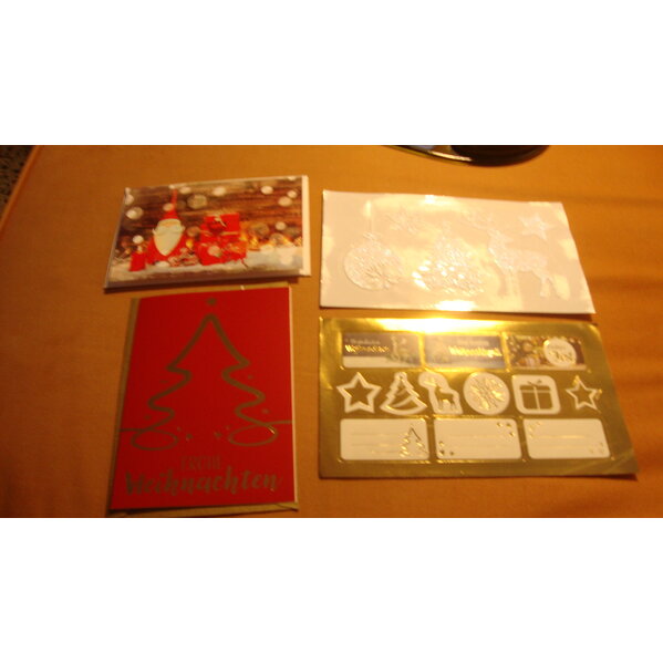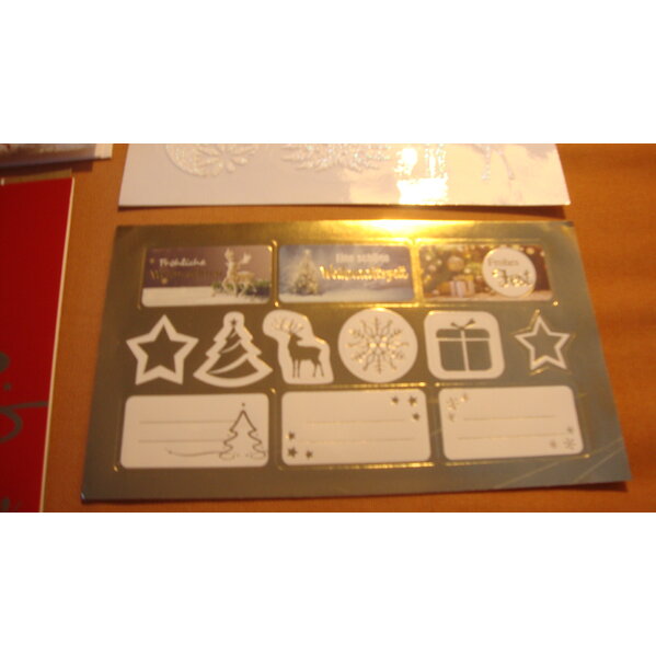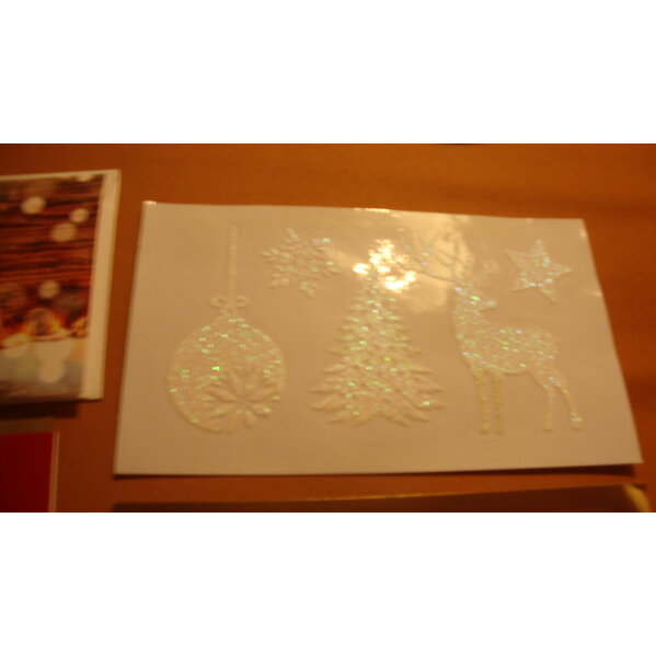Festlichen Fensterbildern, goldglänzenden Aufkebern und zwei Grußkarten mit passenden Kuverts