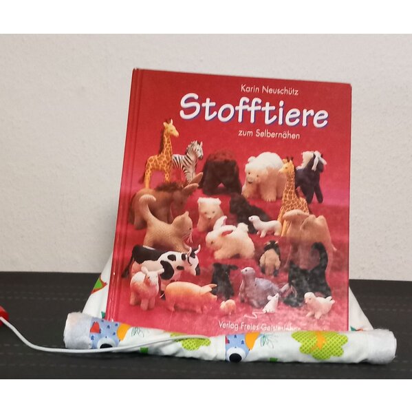 Lesekissen mit Lesezeichen und Tragegriff. Das Lesekissen kann je nach Buchstärke unten variabel aufgerollt werden.