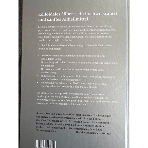 Diese Effekte sind inzwischen auch wissenschaftlich anerkannt und bewähren sich täglich in der Praxis. Das Buch beschreibt die 80 wichtigsten Krankheitsbilder und ihre Behandlung mit kolloidalem Silber bei Mensch und Tier. Es erklärt die wissenschaftlichen Grundlagen und enthält den neusten Stand der Forschung, ergänzt durch Hinweise