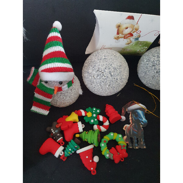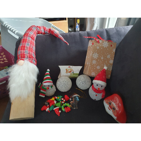 Wichtel, Anhänger, Weihnachtsmänner und Kugeln mit Beleuchtung (evtl. neue Batterie nötig), bemalten Stein, Streudeko