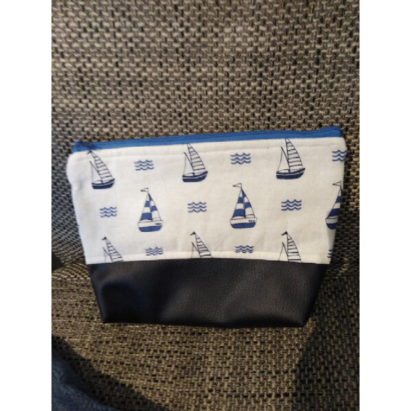 Kosmetiktasche mit Kunstleder und Segelboot Motiven. Sie wurde mit BW Stoff genäht und mit Volumenvlies verstärkt