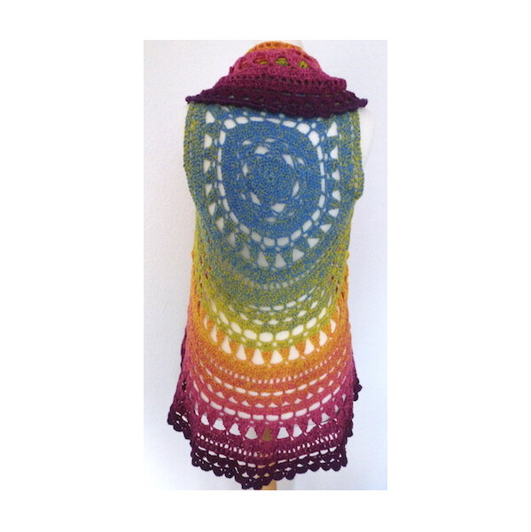 handgehäkelte Kreisweste - nach der Anleitung „Sea Glass“ von Garnstudio, ohne Ärmel, aus 1000 m sechsfädigem Farbverlaufsgarn. Passt etwa bei Größe 40-46, die Schneiderpuppe hat die Größe 42. Ich habe durch mein Hobby einfach zu viele selbstgemachte ähnliche Sachen, daher gibt es dieses Modell hier zum Tausch.
