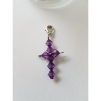 Kreuz Charm Anhänger mit lilafarbenen Perlen. Anhand des Karabiners kann der Anhänger an Ketten, Schlüsselbund uvm. angehängt werden.