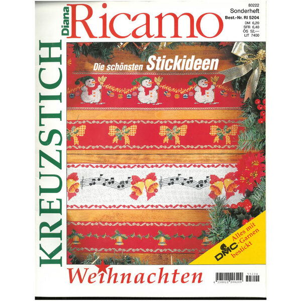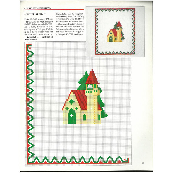 Hier sind viele Kreuzsticharbeiten rund um das Thema Weihnachten farbig abgebildet. Die Stickmuster sind ebenfalls farbig zu sehen.