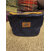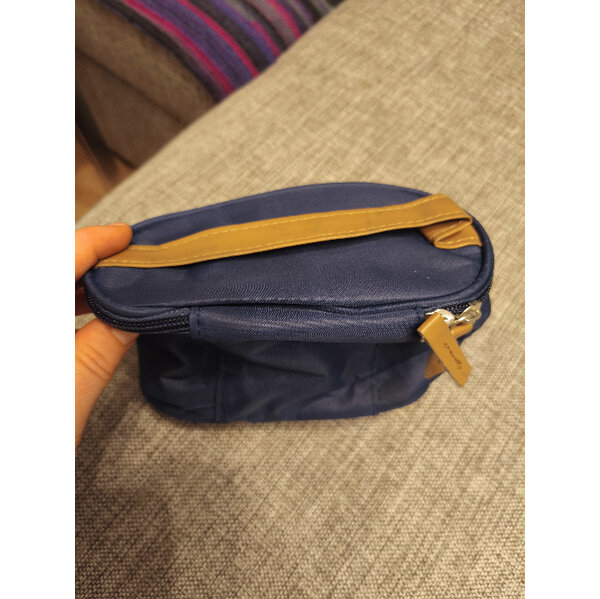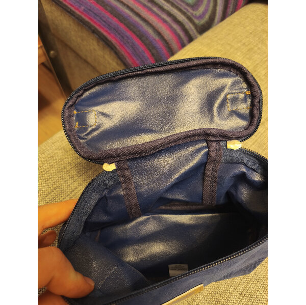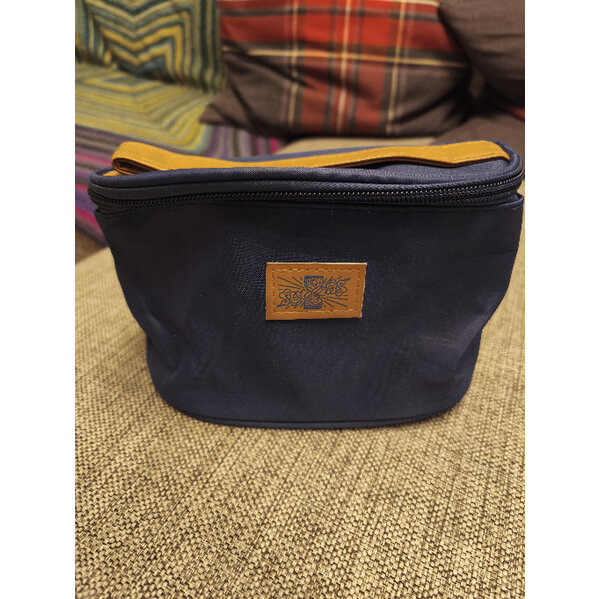 Royalblaue Kulturtasche mit hellbraunen henkel