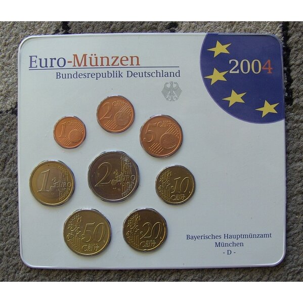 Hier geht es um einen originalverpackten Kursmünzensatz der Bundesrepublik Deutschland geprägt vom Bayerischen Hauptmünzamt in München. Enthalten Sind alle Nominale des Jahrgangs 2004 von 1 Cent bis 2 Euro.