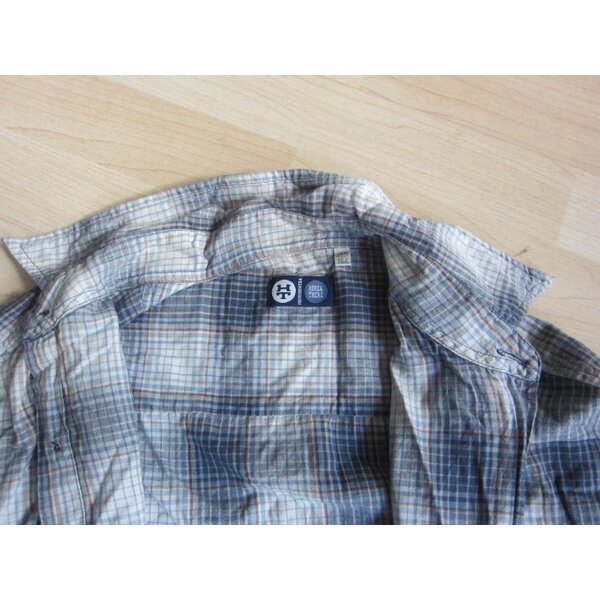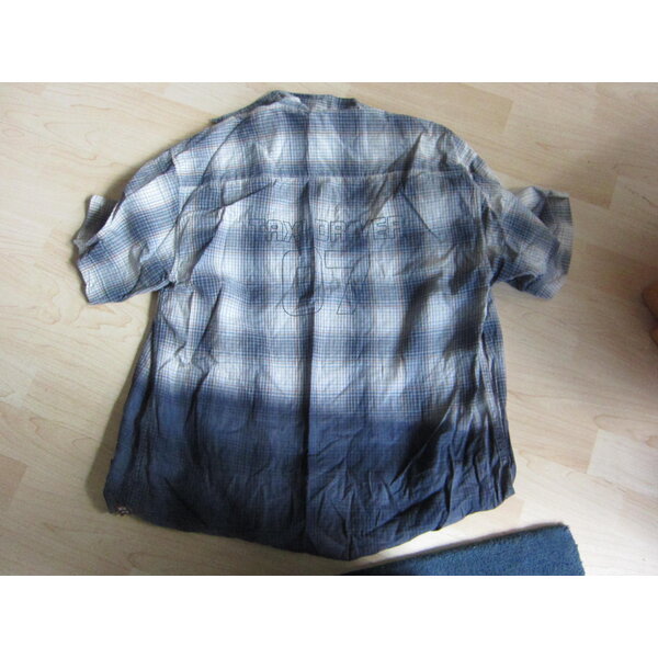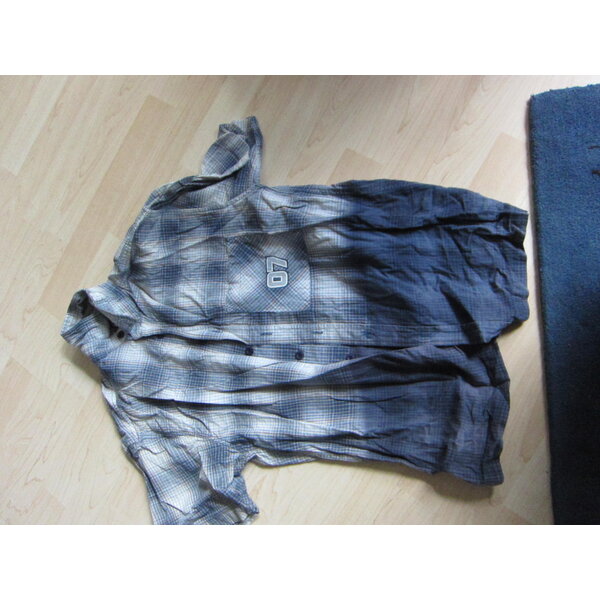 ES handelt sich um ein kurzärmeliges Hemd in den Farben blau und weiß kariert, wobei es von oben nach unten immer dunkler wird. Siehe Foto. Das Hemd ist aus 100 % Baumwolle und hat auch noch den Ersatzknopf.