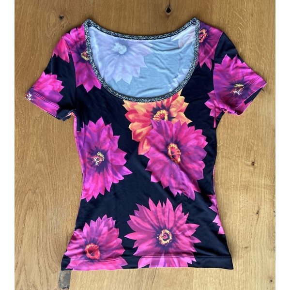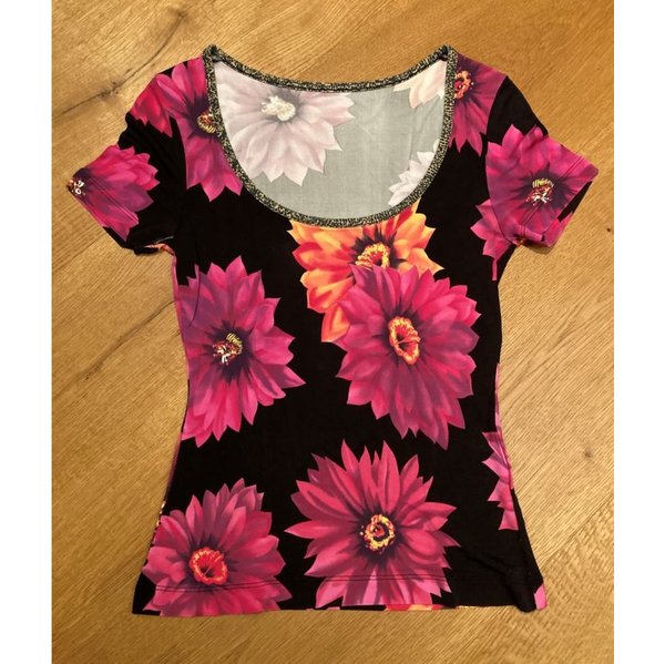 Ein Hingucker! Schmales Shirt mit eingefasstem Ballerina-Ausschnitt im Animal Print. Mit großem Blütenprint in Hot Pink und Orange. Sitzt top auf Figur und ist dabei superbequem!
